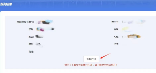 4、核对本人录取信息无误后,点击“下载打印”下载录取通知书。