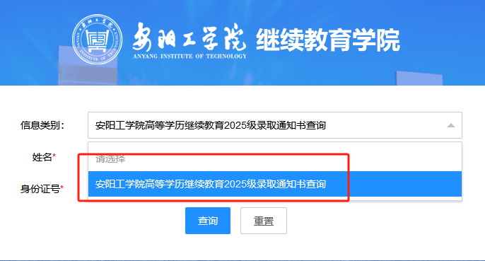 2、信息类别选择——“太阳集团tyc9728高等学历继续教育2025级录取通知书查询”。