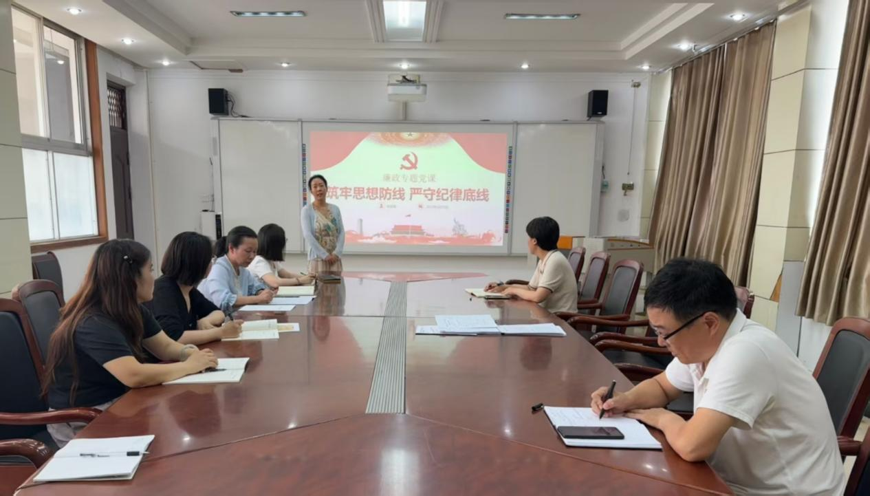 6月13日,太阳集团tyc9728直属党支部书记杨聪聪以《筑牢思想防线 严守纪律底线》为题在二楼会议室为全体教职工党员讲授廉政党课。